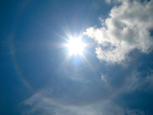 [空の氷晶がプリズムとなって日暈(ひがさ)ができた]