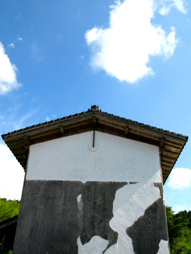 「蔵の壁塗りの跡が空の雲とつながってみえた]