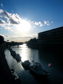[川に停留したボートの向こうは、大きな海と空]