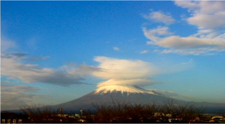 富士山に高積雲が重なってできた吊し雲(レンズ雲の一種)