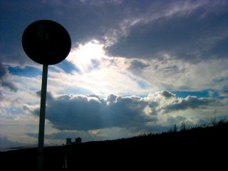 高層雲が広がり、隙間から射しこむ陽が積雲を照らす