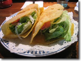 日本では、「タコベル」というメキシカン・ファーストフード店が以前は渋谷などにあったが、ちょっと物足りない。そんなとき、「るるぶ神奈川」で発見したのが「カロ」というレストラン。ここのタコスは本当に美味しい。フレッシュ・レタスがたっぷり入っていて、口当たりは爽やかであるが、トルティーアの味は芳ばしくてとても美味。さらに、ベーコンと塩が絶妙な旨味を放っていて、まさに絶品の一品。飽くこともなく1皿の4片を平らげると、だいたい腹八分くらいでちょうどよい。他にもスパゲティやハンバーグなども美味しいので、みんなで行って、分け合うのもいいかも。トルティーアはスーパーなどでも購入できるので、自分好みの具で作ってみるのも楽しい。