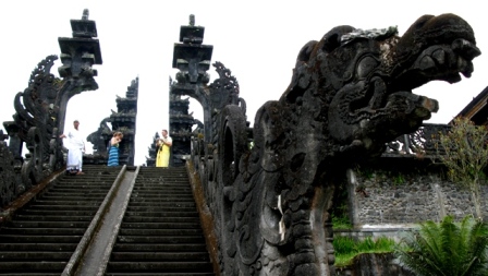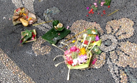 ヒンドゥーを信仰しているバリには、カースト制が残っていて、僧侶、王族、貴族、平民に分かれているが、9割を平民が占め、身分による制約もほとんどなくなっているらしい。いまだに身分差別のあるインドとは、この辺も違うようだ。こういうおう揚なところが個人的には肌に合う気がした。とはいえ、バリ人もとても信心深い。ガイドのマハルディカさんに尋ねてみると、輪廻転生は信じていて、人は土と火と水からできているので、はじめに土葬して4〜5年後に掘り返してから火葬し、その灰をヤシの実に入れて海に流すことによって生まれ変われるという。彼自身は、曾祖父の生まれ変わりだと言っていた。また、村には祈祷師がいて、軽い病気であれば祈祷師に治してもらうという。医者に行くより安いし、本当に治ると言っていた。バリの人は、毎日チャナンと呼ばれるお供え物を作り、家の玄関先や店の入口、塀の凹みなどあらゆるところに置いておく。その数はすさまじく多く、それを毎日欠かさないというからかなり徹底している。総本山であるブサキ寺院にも、必ず年に1度はお参りにいくそうである。