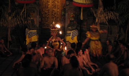 話をバリ舞踊に戻そう。次に観たのがケチャッ(Kecak)。このダンスではガムランは使われず、猿に扮した100名もの男性が「チャッ、チャッ、チャッ…」と大合唱する中で進んでいく。いくつかのパートに分かれた猿の鳴き声(チャッ)は、複雑なリズムを奏で、うねりとなって響き合い、実に不思議な高揚感を生み出していた。物語は、インドの叙事詩「ラーマヤナ物語」をアレンジしたもので、悪の大王ラワナに連れ去られたシータ姫をラーマ王子がガルーダ(インド神話に登場する神鳥)の助けを得て、無事に救い出すというお話。ケチャッの前後に、サンヒャン(Sanghyang)も観ることができた。神聖を意味するサンヒャンは、悪霊払いの儀式で踊られたバリに伝わるダンスである。トランス状態で踊るところに特徴があり、2人の少女が踊るサンヒャン・ドゥダリダンスと、燃えさかる炎の塊の上で青年が踊るサンヒャン・ジャランダンスがあった。特にジャランダンスは、素足で幾度も火の上で踊り、素手で火を掴む激しいもので、圧巻であった。