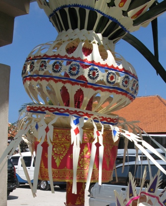 町中で見かけた水盤(上の写真)にもバリらしさが感じられて、思わず足を止めた。ヤシの葉やプルメリアの花は1年を通じて簡単に手に入る。ありふれた材料を巧みに加工し、アレンジすることでこんなにもキレイな飾り付けをして人々の目を愉しませてくれる。ささやかな日常の中に創られた豊かさに、小さな感動が生まれた。