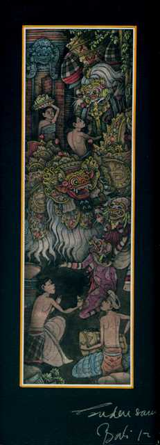 Ketut Soki)によるものである。個人的にはあまり絵を鑑賞する趣味はないのだが、このバリ絵画には、惹かれるものがあった。元々はインドや中国からジャワを渡って伝わったものだそうである。そして、1930年代には統治下にあったオランダの画家らの指導により、バトゥアン・スタイルやウブド・スタイルの絵画が生まれた。そのモチーフとなるのは、バリ民話や日常生活、豊かな自然などである。気に入った絵があれば買うつもりでいたが、一目見て気に入った絵があったので買ってきた(下の写真)。ほぼ同じ絵がいくつかあったので版画なのかと思ったが、よくよく見比べてみると、人の表情や顔の向きが違っており、手描きであることがわかった。複写と手描きとでは、それが世界に1枚しかないという点において大きく違う。人間の価値もそれと似ている。