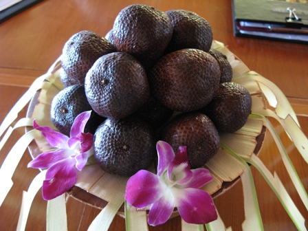 今回、生まれて初めて食べたものがあった。1つは「果物の女王」と呼ばれている「マンゴスチン」。一見硬そうな外観を一皮剥くとフワッと軟らかく(そういう人いますよね…笑)、舌の上で溶ろけてしまう食感と甘酸っぱさがとても美味だった。ドリアン王よりはずっと食べやすくて美味しい。もう1つは「スネークフルーツ」とこれまた怖い名前が付いているのだが、ヘビのウロコに覆われたような外観は、巨大なライチのようでもある。割ると中はまるでニンニクのようで、恐る恐るかじると硬いリンゴのようにコリコリしている。味は甘酸っぱく、悪くはない。果実といえば、生ジュースもよく飲んだ。マンゴー、パパイヤ、ヤシの実などなど。旅行中の水は、すべてペットボトルに入ったものを買って飲んだ。2年前の敦煌で酷い目にあった経験から、危ないと言われているものは決して口にしないことにしている。お陰様でお腹を壊すさずに済んだ。ちなみにバリの水の大半は地下水で、ガイドのマハルディカ家では一度沸かしてから飲んでいるとのことだった。
