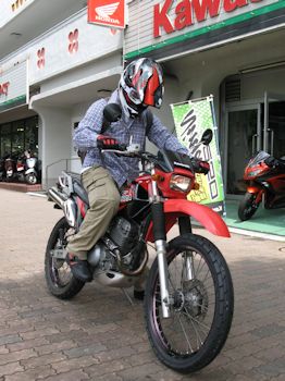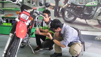 目的地のバイク店BIG FUNは、交通量の多い環七通り沿いにあった。KAWASAKIの正規代理店で、新車と中古を扱っている。息子が選んだバイクは、比較的程度もよく、契約後に前輪を新しいタイヤに交換してくれていた。店員が「長く乗れますよ!」と言っていた(そうでないと困るよぉ〜)。昔と違って、今のオフロード車はセルである。難なくエンジンが始動し、店を後にした。息子は、1週間前に免許を取ったばかりで、公道を走るのも初めてである。いきなり交通量の多い環七を走らなければならないので、おっかなびっくりである。ギアチェンジは、スムーズにできているようだが、車の流れにはなかなか乗れず、イラだった後続車が次々追い抜いて行った。しばらくは、我慢してもらうしかない…。にメジャ