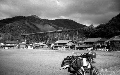 第二の故郷「近江八幡」を離れ、生まれ故郷の京都で1泊し、翌日、日本海へ出た。天橋立を通ってさらに西へバイクを進めると、のどかな田園風景の中でバッタリ巨大な鉄橋に出くわした。畦にバイクを停め、電車が来るのを待った。こんな田舎じゃ、電車の本数もかなり少ないだろうと長期戦を覚悟したが、案外すぐに来たので、慌ててシャッターをきった。高さ41.5m、長さ310.6mの鉄橋を国鉄山陰本線がゆっくりと走っていく。明治42年、当時のお金で33万円、2年間の工事で建築された余部鉄橋は、風景と相まってとても優美だった。