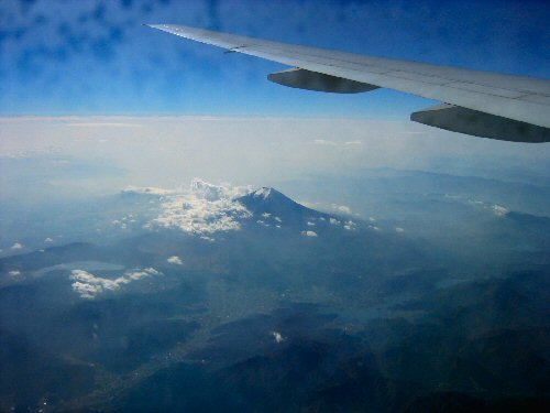 10時55分。窓からの景色がとても綺麗になってきた。空の青と薄い雲の白がグラデーションになって、その彼方に地平線が伸びている。近ツリに行ったときの話では、飛行機の方はビジネス客で満席で、チケットが取りにくいと聞いていたが、この便については、ガラガラだった。まあ、今となってはどっちでもいい話だが…。窓から富士山が見えてきた。こうして上空から見ると、限りなく美しい山だと思う。周辺に山がなく、富士山だけがニョキッと地球から飛び出していて、その頂上だけが白く雪化粧している。この富士山を見られただけでも、今回の旅行に来た甲斐はあったと思えるくらい感動的だった。