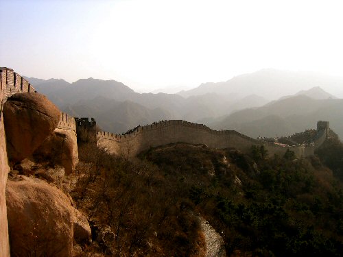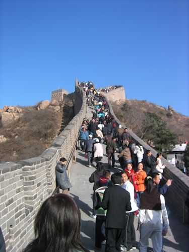 そして、万里の長城へ。全長6350kmにも及ぶ。どこを見てもいいようなものだが、実際には朽ち果てた場所があったりで、すべてが公開されているわけではない。有名なのは、発達嶺長城や慕田峪長城、司馬台長城などだが、今回はその中でも最もポピュラーな発達嶺長城へ行った。以前は延々と石畳の坂道を登っていったそうだが、今はロープウェイで頂上近くまで簡単に行けてしまう。そこからの眺望は、想像どおりというかそれ以上だった。山々の稜線沿いにどこまでも連なる城壁。一体何キロ先まで見えているのかわからないが、とにかくず〜と遙か彼方までが見渡せる。その大きさは、まさに「遙か」という言葉がピッタリの風景だった。アメリカへ行って、グランドキャニオンを見たときのことを思い出した。あのときは期待ハズレだったのだ。どんなにか大きく、感動するのだろうと楽しみにしていたが、実際に見てみるとあまりにも大きすぎて、「まるで絵のようだ」としか感じなかったのを覚えている。万里の長城にはとても感動した。万感の想いである。長城が中国各地に造られたのは紀元前である。その後、紀元前221年に中国を統一した秦の始皇帝がつなぎ合わせて完成させている。日本列島は沖縄や北方四島を除くとざっと2000kmあるので、その3倍ということになる。そう考えると、ますます大きくて想像できないが、とにかく長〜いのは確かである。