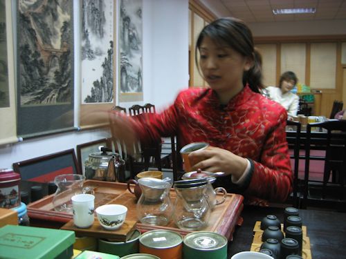 いきなり赤いチャイナドレスの女の前に座らされ、独りぼっちである。ただ彼女は日本語が少々できるので、会話はできた。慣れた手つきで、いろんなお茶を飲ませてくれる。勿論、商売なのだが、どういうわけか結構うまい!ウーロン茶、プーアル茶、ジャスミン茶、ライチ茶などどれも香りがよく、味もしっかりとして美味しかった。値段は安くもなかったが、品質がいいと確信していくつか買ってしまった。こういうときにグループであれば、誰かが買えばいいので気楽なのだが…。