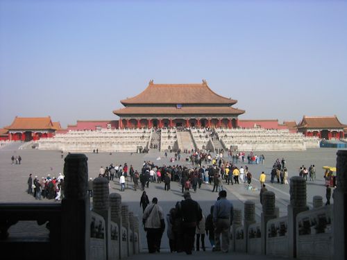 天安門から奥が紫禁城(故宮)である。「紫=高貴な人」以外の立ち入りを禁じるという意味だが、現在は故宮博物院として公開されていて、この日もたくさんの観光客でにぎわっていた。しかし、建物を見ていても、さほど面白くはない。でっかいなぁ、豪華だなぁでおしまいである。本当の面白さは、歴史にある。歴史は、自分の知識と語り部によって面白くも退屈にもなるが、この日は少々退屈だった。紫禁城には明と清の皇帝24代が暮らしたという。どんな皇帝がいたかというと、有名なところでは9代皇帝・咸豊帝(かんぽうてい)の第二夫人の西太后(皇后を東太后と呼ぶ)や、最後の皇帝として有名な溥儀(ふぎ)などがいる。秦の始皇帝から約2000年続いた王朝の歴史は、孫文の辛亥革命により終わるわけだが、映画「ラストエンペラー」に出てきたロケ地などもあって、「へー!へー!」って感じだった。