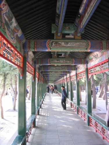 頤和園は行った甲斐があった。もともと清代皇帝の離宮だったのを西太后が改修して、避暑地に使っていたところである。広大な昆明湖は人工の池で、デートにぴったりのロマンチックな場所だった。圧巻は、全長728mにもなる長〜い廊下「長廊」。その廊下の天井に描かれている絵は、8000枚以上にもなる。こうした出費が清朝の滅亡を早めたとさえいわれているほどで、無駄といえば無駄だが、今や世界遺産に登録され、世界中の人が見に来ることを思うと、無駄とも言い切れない気もするし、ものの善し悪しはわからないものである。