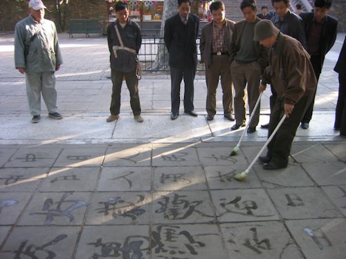 故宮博物院を出ると、道を挟んですぐ北側にある景山公園へ行った。小高い山があって北京市内を一望できるというので登っていったが、生憎展望台が工事中で入れず、それに風がかなり強く砂埃が舞って見晴らしも今ひとつだった。公園の一角に、明朝の最後の皇帝・崇禎帝が人民に追われ首を吊ったというエンジュの木がある。今あるのは、のちに植え直した木らしいが、あまり興味が湧かなかった。広々とした園内を歩いているとき、マス目になった地面に薄く字が見えた。ほとんど消えて見えなかったが、Eさんに訊くと、地面に筆で字を書く習慣があるのだという。このときは「ふ〜ん」という感じであまり気に留めなかったが、あとでもう一度出会うことになる。景山公園に続いてすぐ隣にある北海公園へも行った。歴代皇帝の御苑だったところで1000年の歴史をもつ現存する最古の王宮庭園である。ここでも工事中が多かった。中国は今、2008年のオリンピック開催に向け、町全体が工事中なのである。日本もそうだったが、オリンピックを境に北京の町並みも新しく変わってゆくのだろう。中国の高度成長期が、今まさに始まろうとしていた。