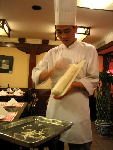 ここでの夕食は、北京料理の1つの山西料理で、刀削麺というのを目の前で実演してくれた。「Tさん、やってみますか?」とEさんに言われて、体験させてもらった。刀といっても薄い鉄板のようなものだが、巨大な生うどんの塊をもって削っていく。案外難しくて、コックさんのような麺にはならず、3cmくらいのブツ切ればっかりになってしまった。