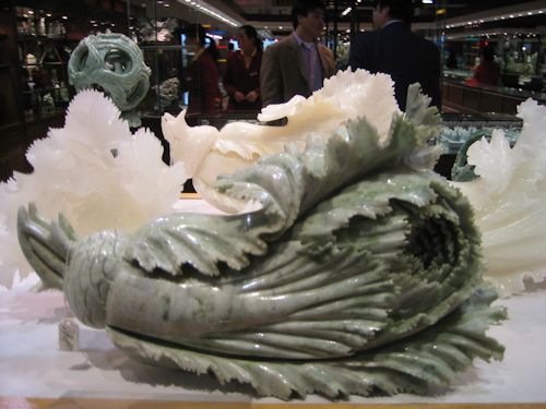 この店で印鑑とガラス玉と音楽CDを土産に買った。ガラス玉といっても水晶玉ではなく、中が空洞になった丸ガラスの内側から絵が描かれたもので、家族の干支に合わせて買った。以前中国へ行った人から、「土産物屋では追っかけてきて売ろうとするから、注意した方がいい」と聞いていたが、そうでもなかった。いらないものは「要らない!」で済んだ。わりと売り込みが激しかったのは、写真にもあるラッキーボールと白菜の彫刻だった。どちらも玉だが、ラッキーボールはサッカーボールのような玉の中に小さな玉が入っているもので、日本でも中華料理店なんかでよく目にするものだ。文字通り幸運を呼ぶ玉として、重宝されている。白菜の方は初めて見たが、今回の旅行中はよく見た。白菜=百財が中国語でも発音が似ているということから、商売繁盛などの意味で古くから使われてきたようだ。面白いから買おうかなとちょっと思ったが、値段が高かったのでやめた。いろいろ買ったが、郊外の店だったので、街中のお店や免税店よりずっと安かった。