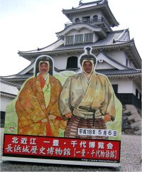 現在の長浜城は昭和58年に再興されたもので、中は歴史博物館になっていた。平成18年4〜11月までは「北近江一豊・千代博覧会」の会場にもなっている。大河ドラマの影響は大きく、町中が「功名が辻」イベントでにぎわっていた。たまたま入った「翼果楼(よかろう)」というお店には「千代御前」というメニューもあった。とても美味しかったのと、上川隆也さんら出演者も以前来たと知って、嬉しかった。