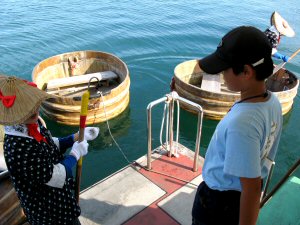 宿根木を後にすると、小木へ向かった。小木港は江戸幕府によって整備され、商業の中心として栄えた港である。ここでたらい舟に乗ることができる。たらい舟は、アワビやワカメ漁用として現在も使われているそうだ。わりと大きいので、乗っても不安はないが、うまく乗らないとバランスを崩しそうではある。カイを漕ぐのはすべて女性の船頭さんである。それほど速くはないが、しかし、わりとスムーズに進んでいく。実際に漕がせてもらうと、これが驚くほ
