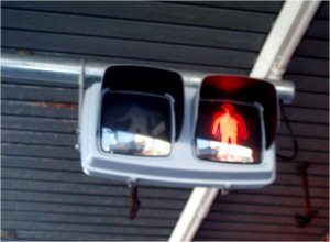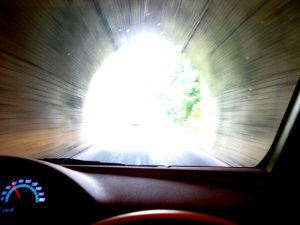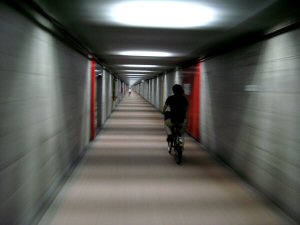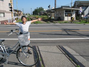 さて、どこに行こうか?これという目的地もないので、とりあえず信濃川沿いを走り、途中から北上して日本海を目指した。ずっと平らな西堀通りを西から東へ走り、どっぺり坂を息切らして登りきると、日本海が一望できる丘に出た。遠くに佐渡島も見えるが、護岸工事中で景観はいまひとつだった。あとで知ったが、新潟市の中心街一帯は、「新潟島」と呼ばれていた。地図でみるとわかるが、信濃川と関屋分水と日本海に囲まれていて、確かに「島」なのだ。そんなこと、知らなかったな〜。楽しかったのは、「新潟みなとトンネル」だった。信濃川の真下を通る全長1.4kmのトンネルで、真夏なのにとても涼しい。遙か彼方までまっすぐに続く真四角の穴は、なんとも不思議な異空間だった。途中で息子が発見したのが、道路で断絶したレールと横向きの信号機。レールは廃線になったJR貨物のようだ。信号機が横向きになってる訳は、残念ながらわからなかった。