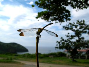 灼熱の太陽に照り焼きにされつつ、海岸に降りた。浜は黒っぽいのでいまひとつキレイではないが、しかし、水中は果てしなく透明だった。水中眼鏡をつけ海の中を覗くと、10m先がみえるほど澄みわたっていた。サヨリの稚魚の大群が水面を泳いでいく様子があちこちに見えたり、50cm以上はありそうな大きな魚がすぐ近くを泳いでいった。息子が本能のおもむくまま、魚を捕ろうとしていた。その捕り方は大胆で、大きめの石を魚にぶつけて採ろうという漁法だが、これが見ていて笑わないではいわれない。水中では水の抵抗が強いので、石を投げてもゆらゆらとしか飛ばないのだ。とてもじゃないが魚は捕れない。しかも、さらに可笑しいことに、そうやって石を投げている息子のそばに、不思議なくらい魚が集まってくるのだった。これはなんだろう?と様子をみていると、どうやら石を投げたときに、石の裏側についてる小さな虫が飛び散って、それに魚たちが群れてきているらしかった。ベラとかタナゴとかキレイな熱帯魚とか、