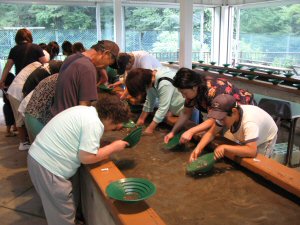 翌朝は、台風4号の影響で曇り空だった。ちょうど佐渡のすぐ上を通過する進路予想が北にそれ、夜のうちに通過してくれていたので、影響も少なく、ホッとした。この日は、まず佐渡西三川ゴールドパークに行った。佐渡では最古の砂金山の跡地で、砂金とり体験ができる。正直、全く期待もなく行ったが、意外に楽しかった。砂を水で流し落としながら、重く沈んだ砂金だけをとるのだが、なぜか面白い。本当は30分間なのに、どの客も止めようとせず、園の人もやりたいだけやってもいいよ!っていう様子だったので、結局、1時間ほどやった。自分は7粒ほどとれて十分満足だったが、息子はその倍もとって、「また来る!」と上機嫌だった。