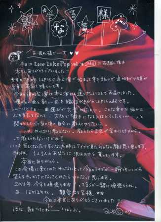 3時間に及ぶライブだったが、そのうち1時間近くはMCだったような気もする(笑)。早口でしゃべりまくって、アンコールのあとも一人残っておしゃべりをして、アカペラでまた歌い、そのあともまだ喋っていた。「しつこいでしょ!」って自分でツッコミ入れてるのが、健気で可愛く思えた。出口のところでは、aikoからの手書きの手紙も配られ、まさに至れり尽くせり。ライブの後1週間ほど、すっかりのぼせてしまっていた…(笑)。