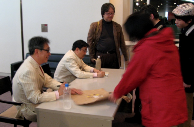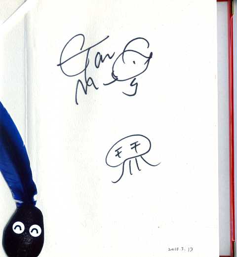 2部構成だったが、瞬く間に過ぎた。そして、「この曲が最後にはふさわしいでしょう」という紹介でアンコールの最後に演奏されたのが、「夕海月」だった。そう、「champloo2009」に収録して、今回のライブにくるきっかけとなった「夕海月」である。不思議な偶然を感じながら、すっかり満喫した。ライブの後、サイン会があった。CDまたはグッズを購入した人が対象というので、僕はエコバッグを買って、愛用しているノートにサインしてもらった。チチさんはクラゲマーク!(笑)「夕海月」好きなんですよとチチ松村さんに言ったら、「キレイな曲ですよね〜」と静かに微笑みながら応えてくれた。そう、確かチチ松村さんは、海月(クラゲ)を飼ってるのだ。なんだか、面白い人たちである。