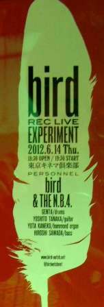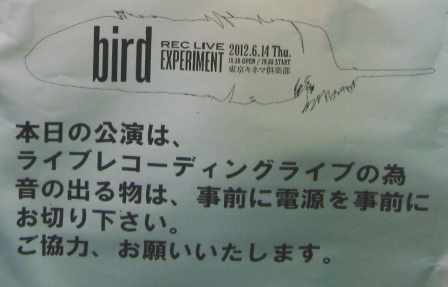 19時30分、オープニング。GENTAさん(d)、田中義人さん(g)、金子さん(k)、初参加のベーシストさんに続いてステージに現れたbirdは、スポットライトに照らされて、キラキラと目映かった。ステージまで4、5メートル。視線が合えば気付きそうなくらい、声をかければ誰とわかるくらい、近かった。1曲目は「DA