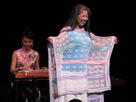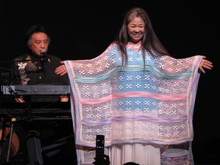 途中で5分間の撮影タイムがあった。古謝さん自らが作った服装を見せてくれたのだ(下写真)。それからアンコールが楽しかった。会場からのリクエストに応えて歌うのだが、久しく歌ってない歌は歌詞がおぼろげ。歌えるかどうかわからないまま演奏がはじまり、ギリギリで何とか歌ってしまう姿がプロだなぁと思えた。