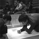 ペニーさんとは不思議な縁である。2001年1月27日、大雪の降った「耳の穴」1周年記念ライブ「Live Snow」に来られなかったペニーさんに、当日ライブペインティングをやった本田周の応援に来ていた友人が「T ROOM」を紹介してくださったのが最初である。そして、ペニーさんのサイト「坊さんごっこ」と相互リンクさせてもらうことになり、お互い映画「ガープの世界」をはじめ好みの共通項が多いことからネット上では大の仲良しになったものの、今日初めて会ったという経緯である。しかも、今日会ってみると、ペニーさんは友人の息子にそっくりで、もう初対面から他人とは思えず、本当に不思議な感じだった。今日は、ペニーさんがライブペインティング初挑戦ということも不思議な巡り合わせだったが、その絵に私の息子も参加させてもらうという予期せぬ展開になり、ただただ不思議だった。ペニーさんの絵は、「子供の絵心」を忘れてない絵で、その人柄そのままの絵でした。息子と遊んでくれて、感謝!感謝!