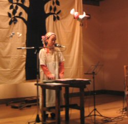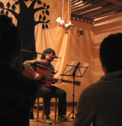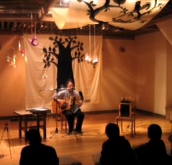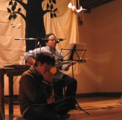 くぼあつこさん。以前、後藤氏からMDを聴かせてもらったことがあるが、日常ボクが聴かないような音楽で、どうもうまく消化できないという印象があった。キーボードの弾き語り。歌声は独特で、それが武器であり、両刃の剣のように思えた。「自分の音楽をやる」という強い意志が伝わってきて、その部分に感銘を受ける。たぶん、表現したいのは、メロディよりも詞の世界なのだろうと思えた。ボクのように言葉も音として聴いてしまうようだと、詞の世界を取りこぼしてしまうのかもしれない。音響があまりよくなかったことが残念だった。それと、曲に合わせてもっと色々なアレンジがあれば、ボクのように音から聴いてしまうリスナーの場合は、消化を助けてくれるのかなという気がした。聴いていて「えっ、何!」という感じにさせる音楽である。岡本太郎のいう芸術とは、くぼさんのような音楽をいうのかもしれない、そんな感想をもった。