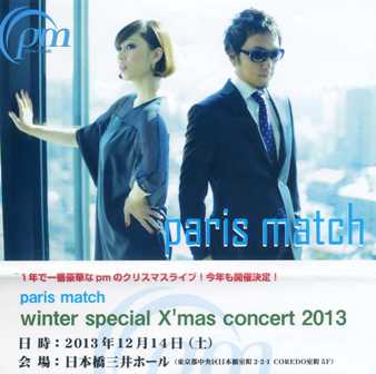 今年最後のライブ鑑賞である。「わ〜い、クリスマスだ〜!」と盛り上がる頃は知らぬ間に過ぎてしまったし、クリスマス・ソングも世の中に多すぎだろうと思うのだが、イルミネーションに彩られたこの季節の浮かれた雰囲気は嫌いではない。2012年は行きそびれてしまったので、パリスマッチの「1年で一番豪華なクリスマスライブ」は2年ぶりになる、と書いてみて、2年間があっという間に過ぎている事実に改めて驚いてしまう。「一体、僕は何をやっていたのだろう?」きっと、何かやってたとは思うのだが…。