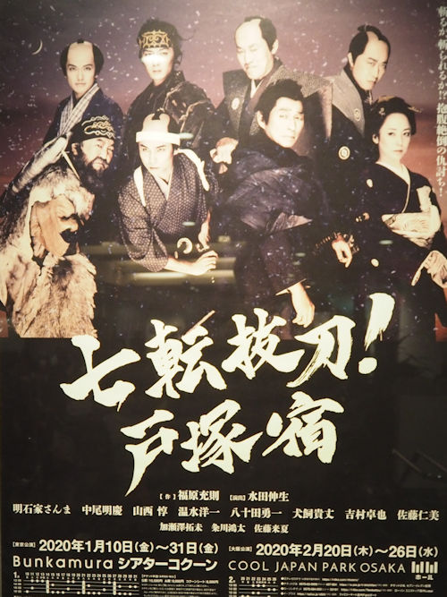 時代物である。時は1865年(慶応元年)。明石家さんま扮する浪人・尾長は、訳あって、鳥居房蔵という武士に命を狙われていた。尾長は房蔵の父、嘉十郎を暗殺したため、息子の房蔵が仇討ちのため、探し続けている、というところから話は始まるのだが、とにかくお笑い満載で笑いっぱなしだった。役者でもないさんまさんに本格的な芝居ができるのだろうか、といった心配は全く無用だった。バラエティ専門と思いきや、舞台も20年来のキャリアがあり、そうそうたる役者の中にあって、主役として圧倒的な存在感があった。台本は、当て書きで作られていて、幕末にさんまさんが生きていたらこうかな、という話である。とにかく、笑うことに飽きるほど、ずっと面白かった!