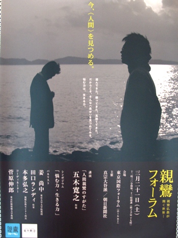 フォーラムは2部構成になっていて、はじめに五木寛之さんの講演「人間親鸞のすがた」が1時間半あった。五木さんの著作は「蓮如」くらいしか読んだことがないし、話を聞くのも初めてだったが、これが本当に素晴らしかった。冒頭にご本人が話していたのは、「講演なのだから、下向いてメモばかりとるのではなく、話し手の身振り手振り、表情をみて、感じとることが大事」ということだった。それは、親鸞が書き物を何も残さず、すべて言葉を語ることで教えを広めていったことの意味を、五木さん自らが実践しながら教えてくれてることでもあった。音楽のライブにも通ずるが、人が語る言葉を生で聞くことには、もの凄い力がある。勿論、語り部がしっかりとしたものをもっていての話だが、五木さんのは、これぞ語りというくらい饒舌でリズミカルで描写が的確で内容的にもとても濃いものだった。なぜ、今、「蟹工船」が売れているのか?「カラマーゾフの兄弟」も売れ、次は、「歎異抄」ではないか?という切り口から、今の時代における親鸞の意味を話されていた。なぜ、年間3万人もの日本人が自殺しているのか?親鸞が生きた時代は末法の時代だったが、今またその時代なのではないか?北朝鮮に抑留され、何年も経ってから引き上げてきたという自らの戦争体験にも触れられ、罪の意識を生涯背負ってきた中で親鸞に出会ったことも紹介された。情(こころ)を大切にすること、それが今、一番必要なことだというメッセージだったと思う。とても心に染みてくるいいお話だった。