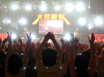 新曲の発表もあった。スタジオ録音はこれからで、そこに会場の声を入れたいという。歌詞を映し出し(下写真)、歌の練習をして、2回ずつ録音をした。うまく録れたようだ。さらにジャケットにも観客を入れたいというので、1万5千人で写真を撮ったりもした(上写真)。その一体感が大感謝祭を絶頂に高めていった。