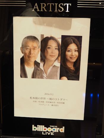 当時の彼女が大瀧詠一の大ファンだったので少しだけ、はっぴいえんども聴いたことがある、程度である。活動期間わずか3年、オリジナル作品2作のみでありながら、つねに伝説的バンドであるが、個人的にはそれほど好みではなかった。2013年12月、大瀧さんが65歳の若さで急逝。彼女(現妻)は、あまりに突然の訃報に喪失感を感じていたに違いない。大瀧の死が影響したのか定かではないが、2015年7月、松本隆の作詞活動45周年を記念するライブ「風街レジェンド」が盛大に開かれた。当然ながら妻は馳せ参じ、僕は留守番だったのだが、その頃から松本さんをテレビ番組などで知るうち、その人柄に興味をもつようになった。風になびくようなしなやかさと内に秘めた強い決意。剛柔を併せ持った人柄に惹かれたのだと思う。今回のライブに行こうと思った理由の1つがそれで、もう1つが若村麻由美である。「初恋の人」は原理的に一人でなければならないが、若村扮する早乙女翠は自分にとって「初恋の人の一人」である。翠は87~88年に放送されたNHK朝ドラ「はっさい先生」のヒロインで、若村さんのデビュー作である。おてんばなところは、武者小路実篤の小説「愛と死」の夏子と同じで、ドラマ「蔵」で松たか子が演じた烈などともに、若い頃のボクは大抵、意思の強い女性に憧れていた。松本隆の詞の世界を若村麻由美の語りと村治佳織のギターで味わうというのが、今回のライブである。出演者にとってもリーディング・ライブは初の試みで、ビルボード東京でも初めての企画らしい。さて、どうなることやら、観客、演者ともに初のイベントをドキドキしながら迎えたのである。