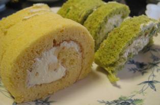 写真上のロールケーキは、トマト(左)とカブ(右)のベジロール。