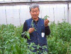 農林大臣賞を受賞したトマト専業農家(下野地区)の熊倉氏は、1200坪のロックウール栽培で減農薬に取り組み、